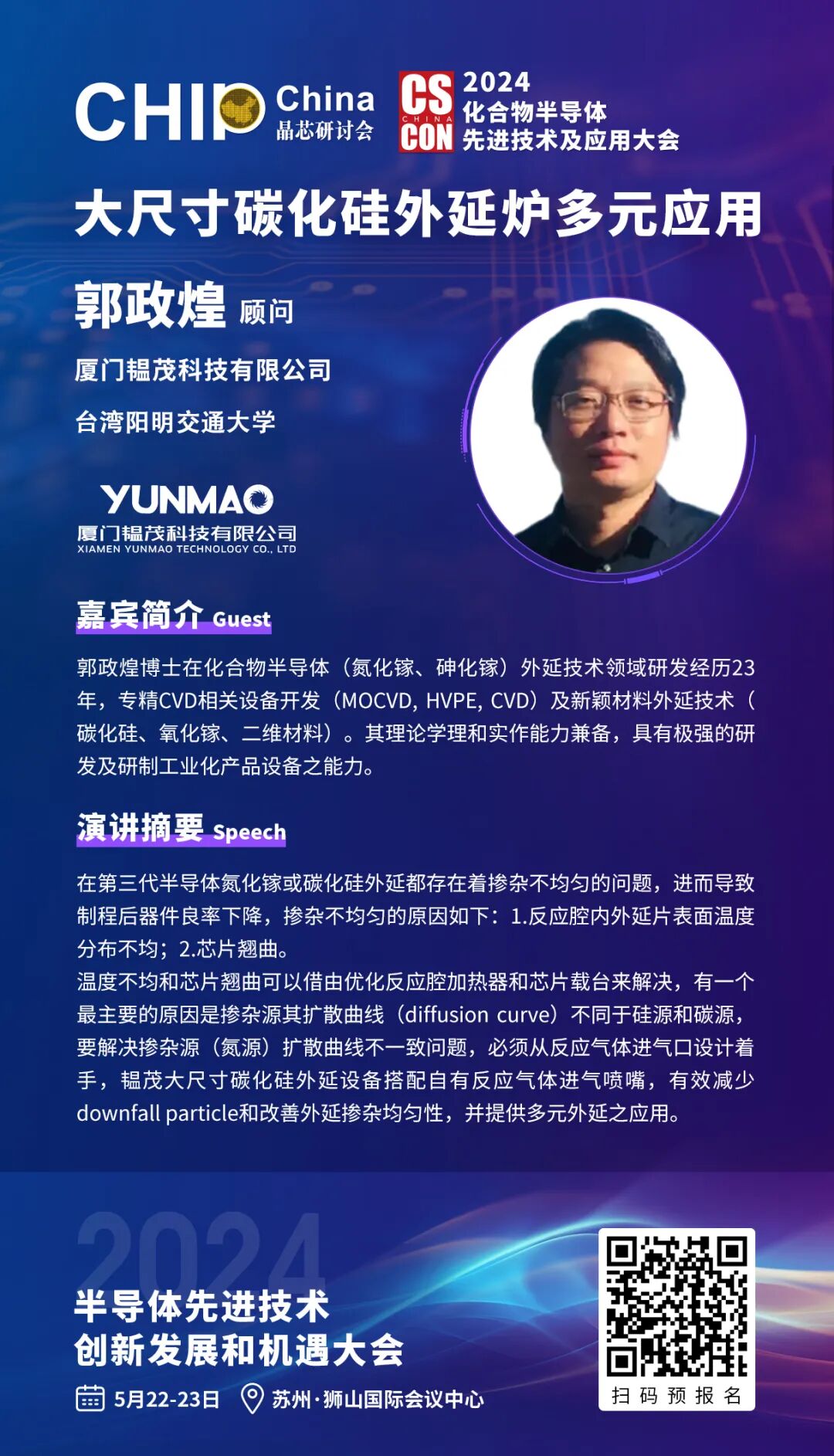 厦门韫茂科技有限公司顾问—台湾阳明交通大学郭政煌教授将在本次会议上做专题报告,与您一起探讨化合物半导体领域的大尺寸碳化硅外延炉多元应用。
