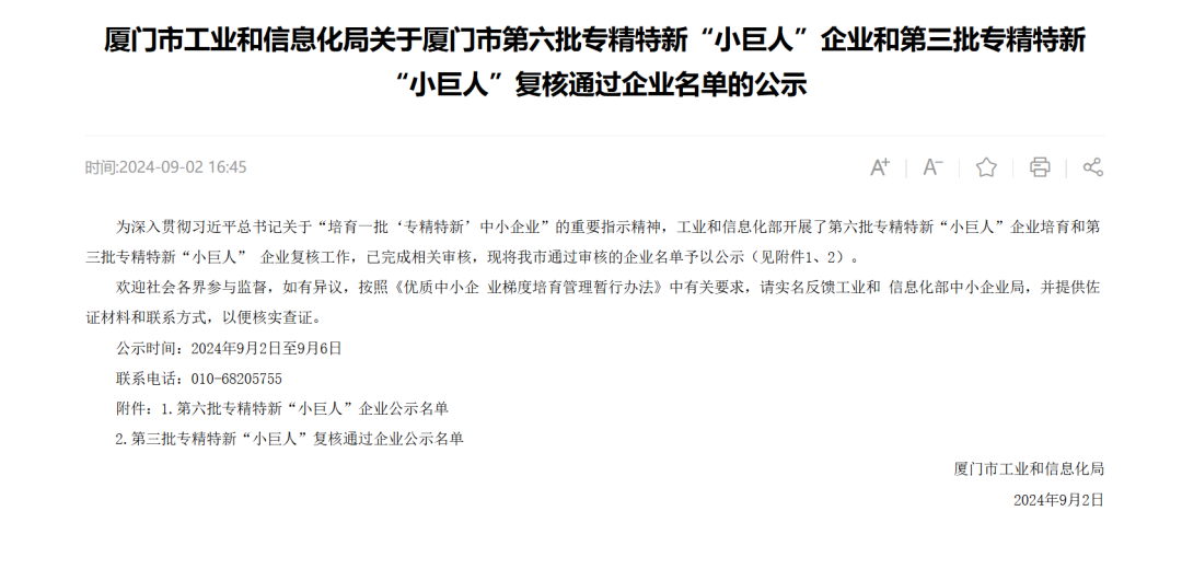 9月2日,厦门市工业和信息化局官方发布了工业和信息化部认定的第六批专精特新“小巨人”企业公示名单,厦门韫茂科技有限公司有幸获评国家级专精特新“小巨人”企业。
